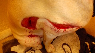 Haar baasje was aan het werk met de heggenschaar in zijn achterzak en Qimmiq rende er vol in! Haar hele rechter flank lag open, vanaf haar schouder tot aan haar buik. Zoals u ziet op de foto een flinke wond. Uiteraard