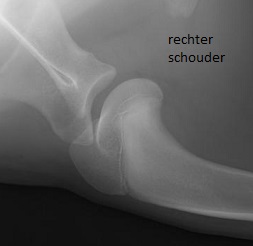 Zijn rechter schouder was keurig, maar ter hoogte van zijn linker schouder was er een afwijkende rand aan de onderkant van het schouderblad zichtbaar. Dit duidt op osteochondrose: een erfelijke kraakbeenziekte, die voorkomt bij honden tussen de 4 en 10 maanden leeftijd. Hierbij wordt het kraakbeen te dik, waardoor stukjes kraakbeen kunnen afsterven en los kunnen raken in het gewricht. Dit kan de nodige pijn en irritatie in een gewricht veroorzaken, waardoor een dier continue mank gaat lopen.