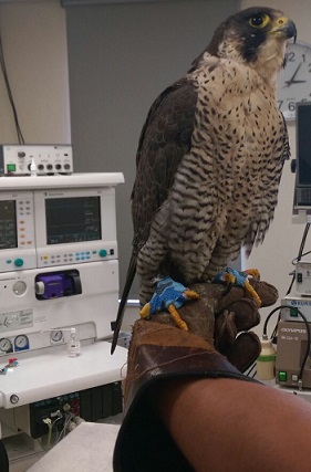 Een 4 jaar oude vrouwelijke slechtvalk was bij een nieuwe baas terecht gekomen omdat de vorige eigenaar haar wilde laten inslapen vanwege haar pootproblemen. Ze heeft een aandoening die "bumblefoot" wordt genoemd. Door langdurig slechte huisvesting, waarbij de zittakken niet aangepast zijn aan de grootte van de poten, kan dit probleem ontstaan. De poten raken beschadigd en er ontstaan wondjes. Via deze wondjes kan er een bacterie onder de huid komen. Deze verooraakt een ontsteking onder de huid. Als de infectie zicht uitbreidt ontstaan er flinke zwellingen aan de poten en dit was bij deze slechtvalk ook het geval. Haar nieuwe baas wilde haar gelukkig hieraan laten helpen en dit gebeurde in de operatiekamer bij ons op de kliniek in Echt. Op de foto ziet u de slechtvalk in de operatiekamer.