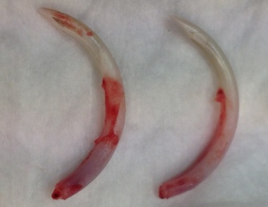 Hieronder ziet u beide ondersnijtanden nadat ze verwijderd zijn.Als u naar de rechter snijtand kijkt is het onderste deel waar het bloed begint, het begin van de wortel. U ziet dat de wortel nog langer is dan het kroongedeelte (het deel dat normaal zichtbaar is) en kunt zich voorstellen dat het een behoorlijke klus is om deze snijtanden te verwijderen. Het vergt veel geduld en een juiste techniek om te voorkomen dat ze afbreken.