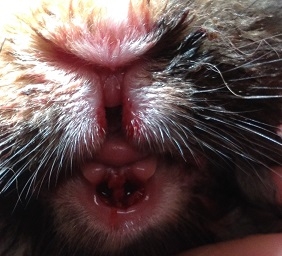 Links ziet u het bekje van Moos nadat alles verwijderd is. Het bloeden is volledig verstopt en Moos begint al wakker te worden. Het is keurig naar wens verlopen.